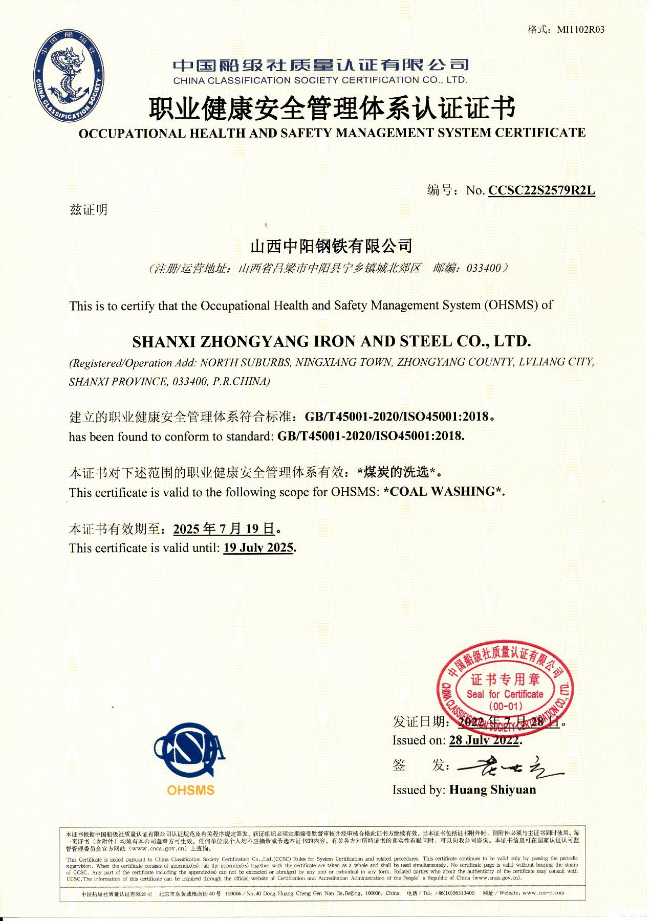 職業(yè)健康安全管理體系認(rèn)證證書(shū)(煤炭洗選)