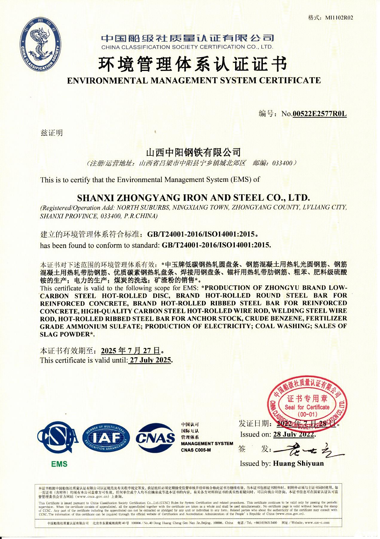 環(huán)境管理體系認(rèn)證證書(shū)